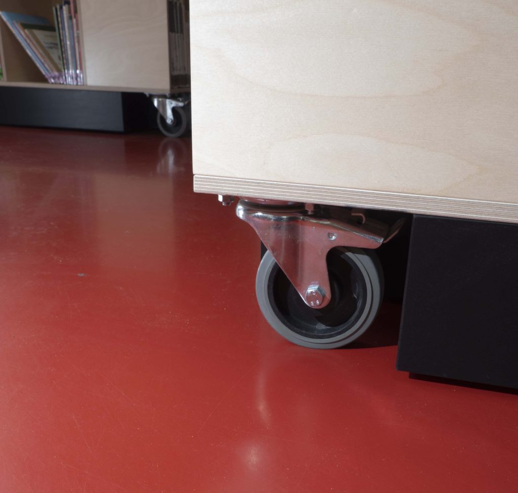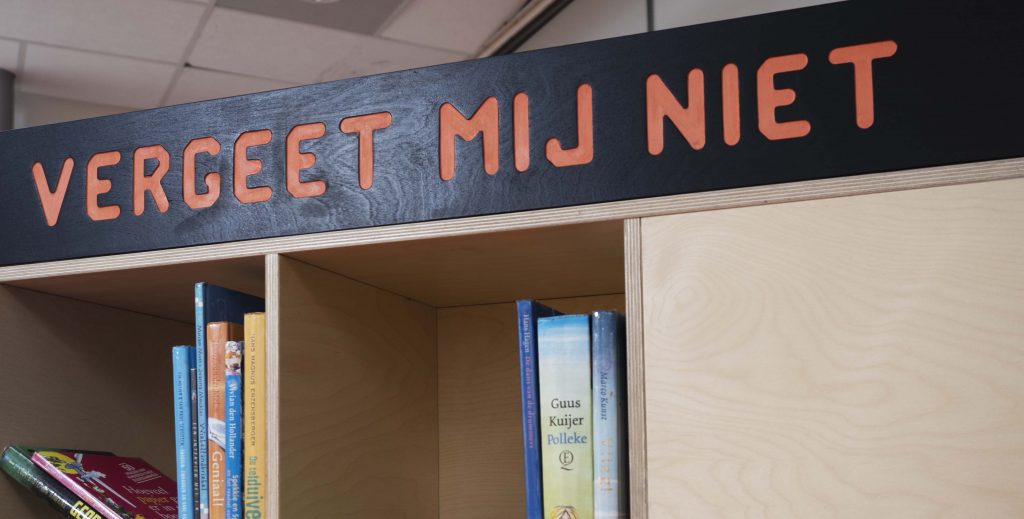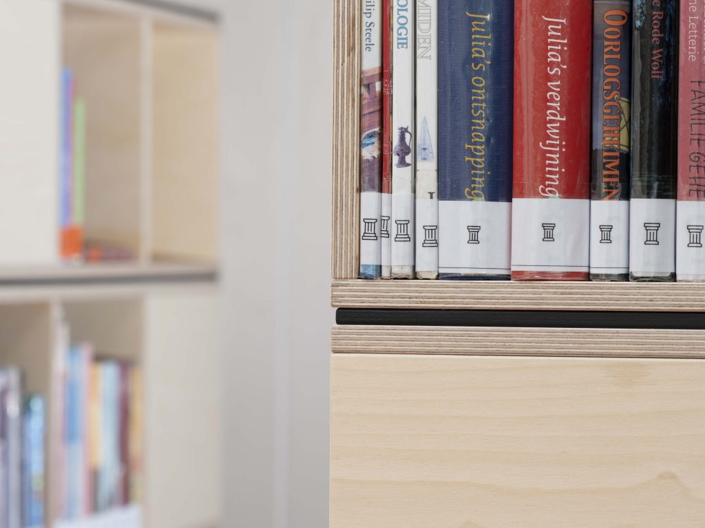 Voor een basisschool maakte BAS Meubelmakerij 2 bibliotheekkasten op wielen. 1 meter breed en 2 meter hoog. Gemaakt van berken multiplex afgelakt met een watergedragen parketlak. In de 8 banners zijn teksten uitgefreesd. De teksten zijn bedacht door de medewerkers van de school. Elke banner is ingekleurd met een eigen kleur.
