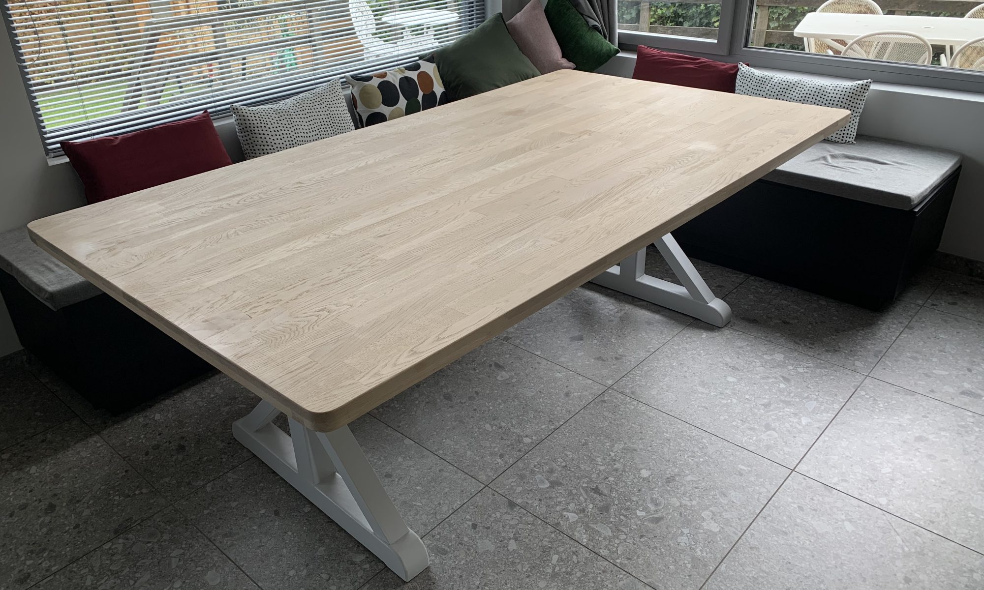 Het onderstel van de tafel is voorzien van kruizen zodat het de look heeft van een kloostertafel.