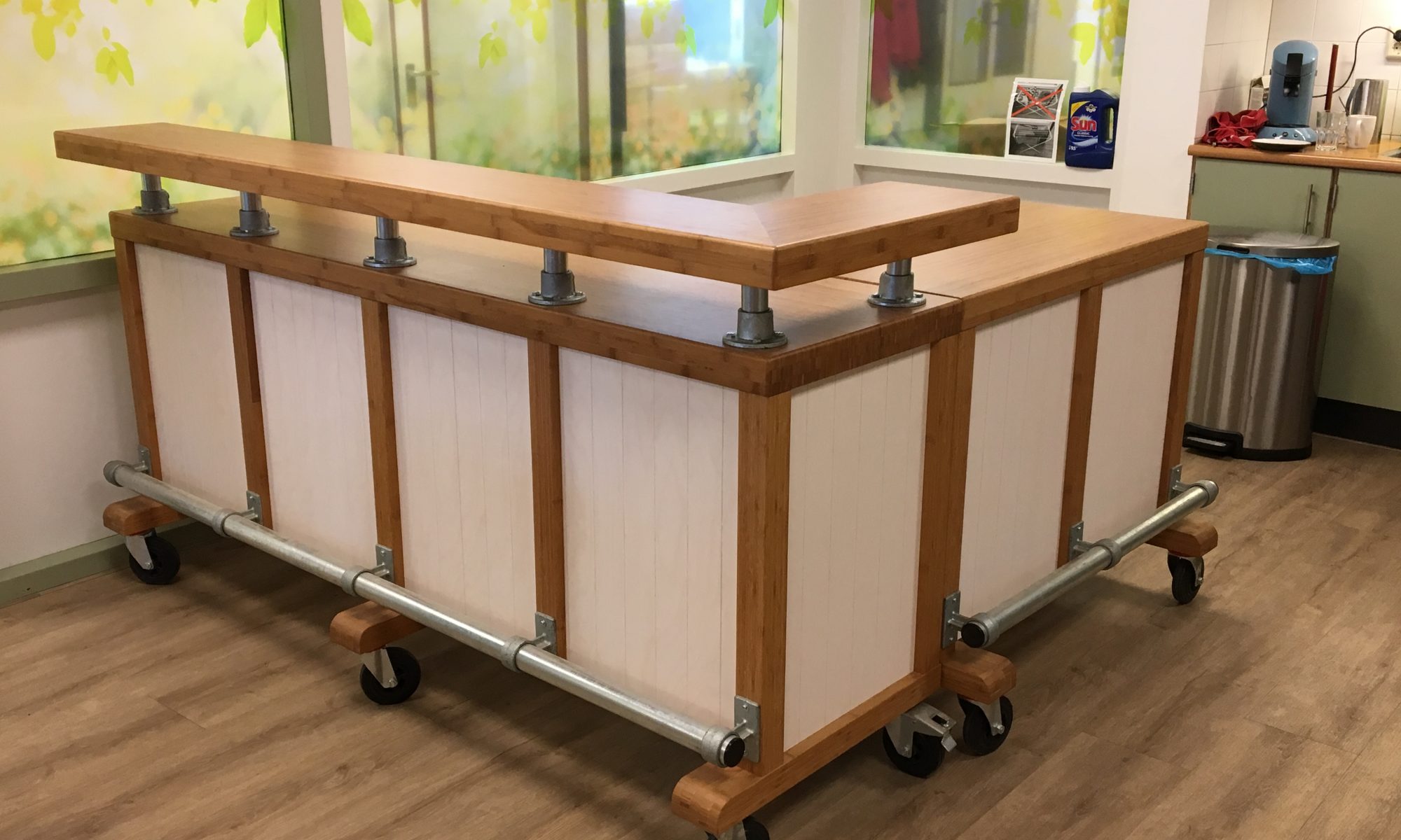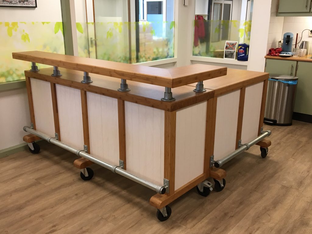 Bij een dagbesteding in Leiden waar de kantine opgeknapt was zocht deze klant als toevoeging voor deze ruimte een bar. Na wat gesprekken en schetsen bedacht BAS Meubelmakerij een verrijdbare bar uit 2 delen zodat deze ook gebruikt kan worden in een andere opstelling voor andere gelegenheden. De bar is gemaakt van berken multiplex. De panelen zijn ingefreest zodat het lijkt of de bar opgebouwd is met planken. Het barblad en de verticale strips zijn van bamboe karamel en geven de bar een warm karakter. Daarnaast is er gewerkt met steigerbuis om de bar een stoer karakter te geven.