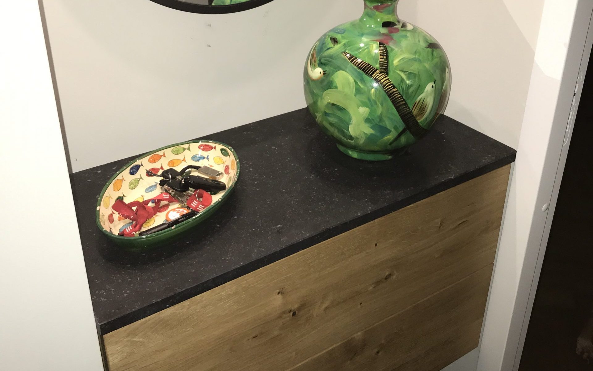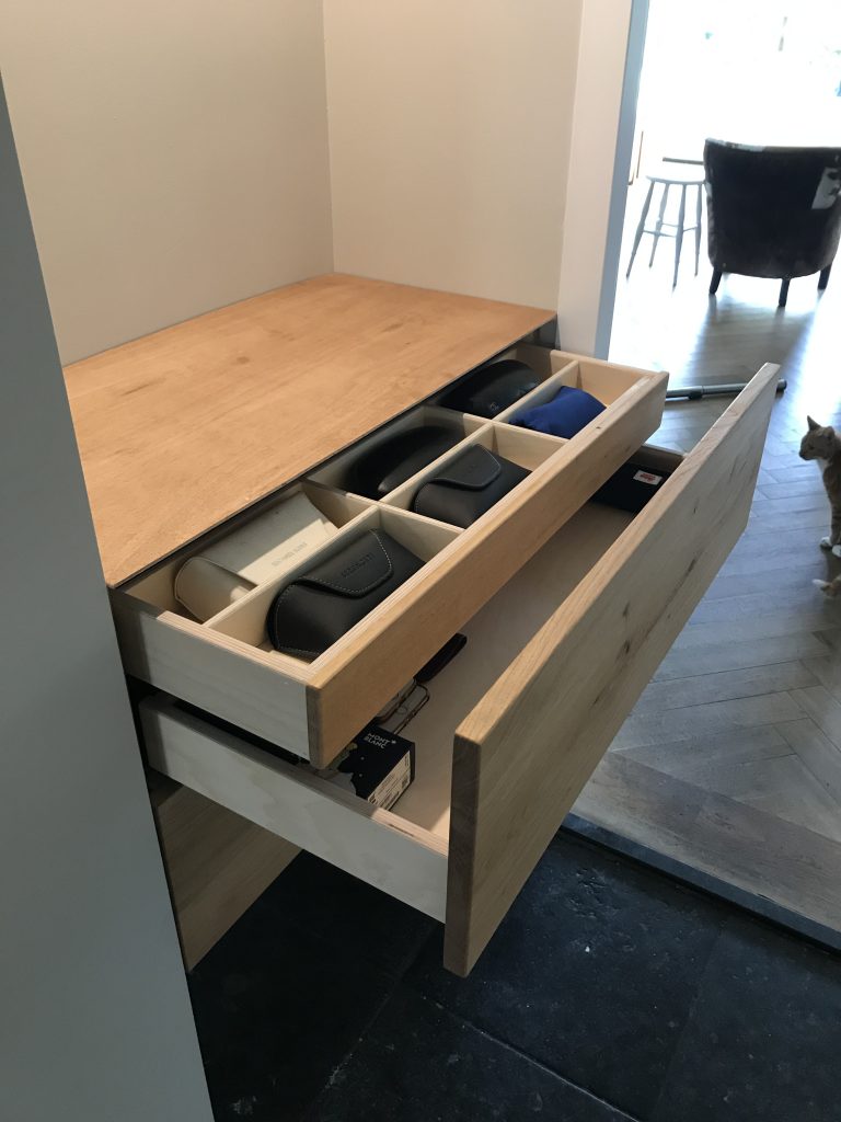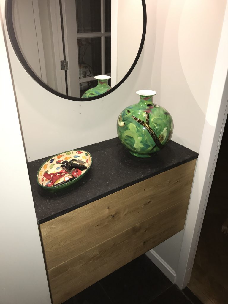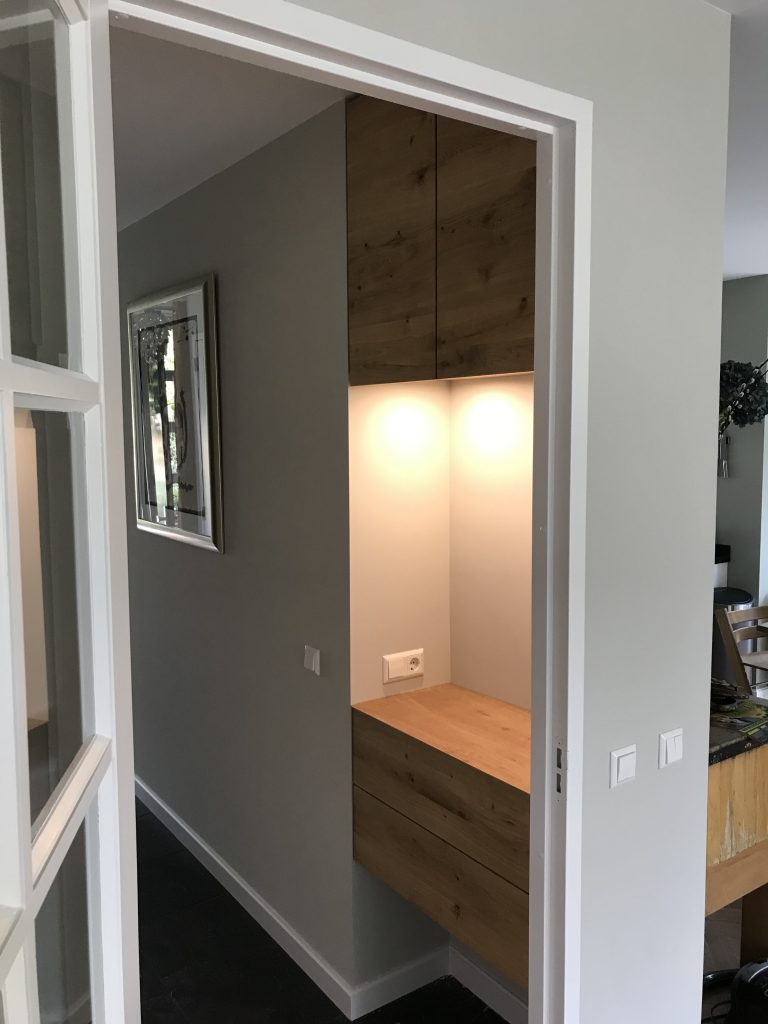 In de gang bij deze klant zit een nis. De vraag was om met een oplossing te komen die zorgt voor opbergmogelijkheden, verlichting en tevens een verrijking is voor de gang.