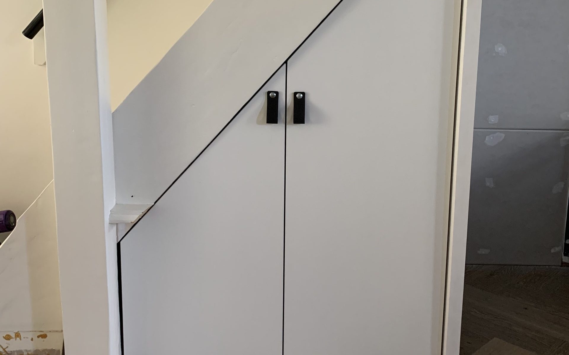 2 garderobekastjes voor onder de trap op zwenkwielen. Aan de onderzijde van de kastjes en op de vloer zit een geleide systeem zodat de kastjes elkaar niet raken bij het in- en uithalen.