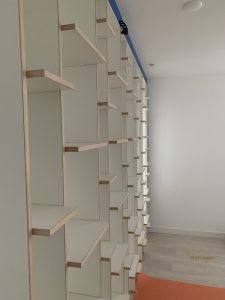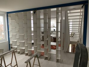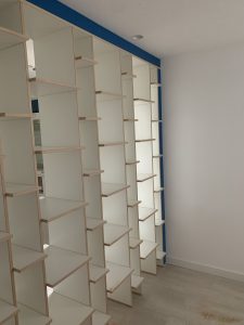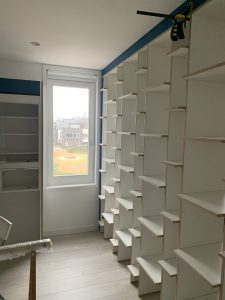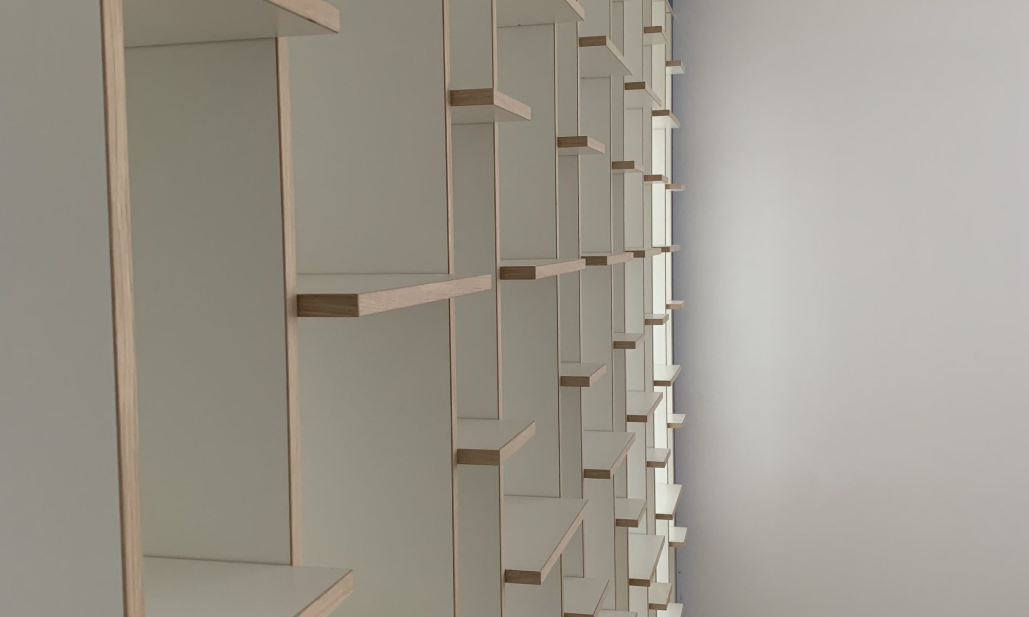 Om een nieuwe gebouwde ruimte te verdelen was het voorbeeld een kast uit een woonwinkel. Dit voorbeeld werd uitgewerkt naar de gewenste maten. Als extra detail werd toegevoegd de massief eiken herlijsten op de kopse kanten van het melamine plaatmateriaal