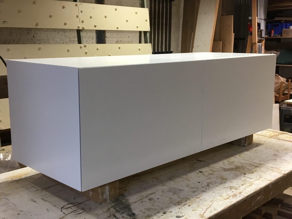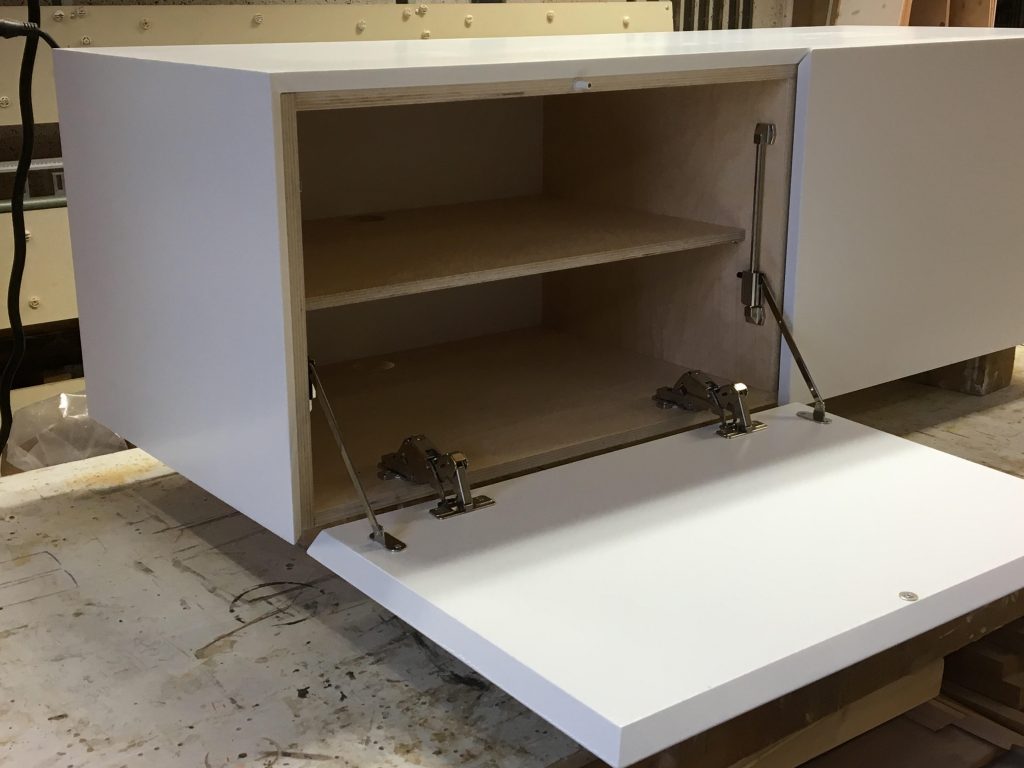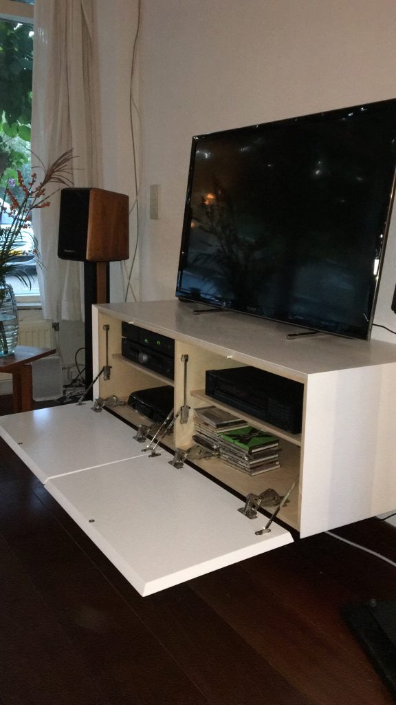 Zwevend TV meubel gemaakt van berken multiplex en MDF.