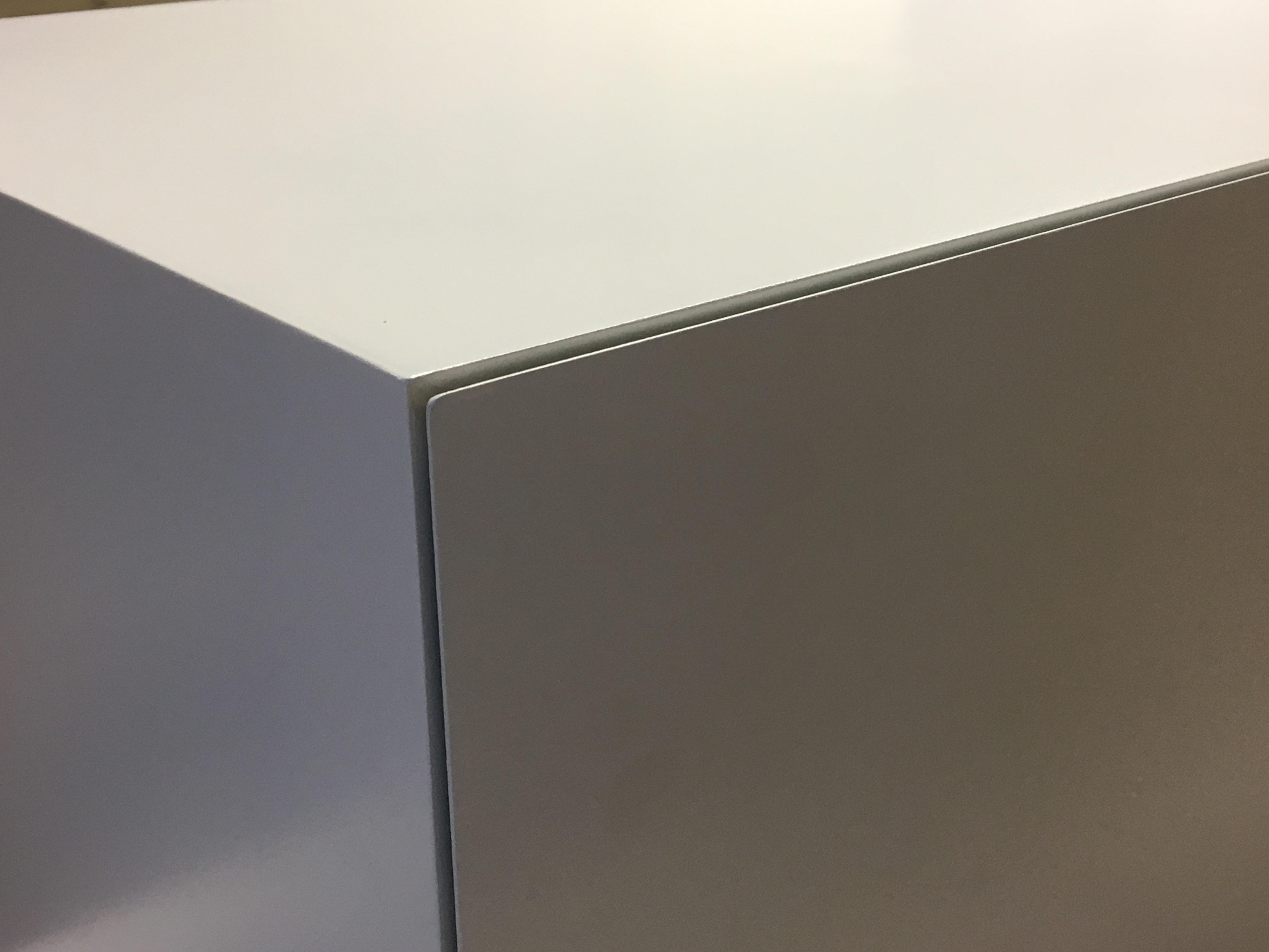 De buitenzijde van het meubel en de klepjes zijn onder verstekken gezaagd.